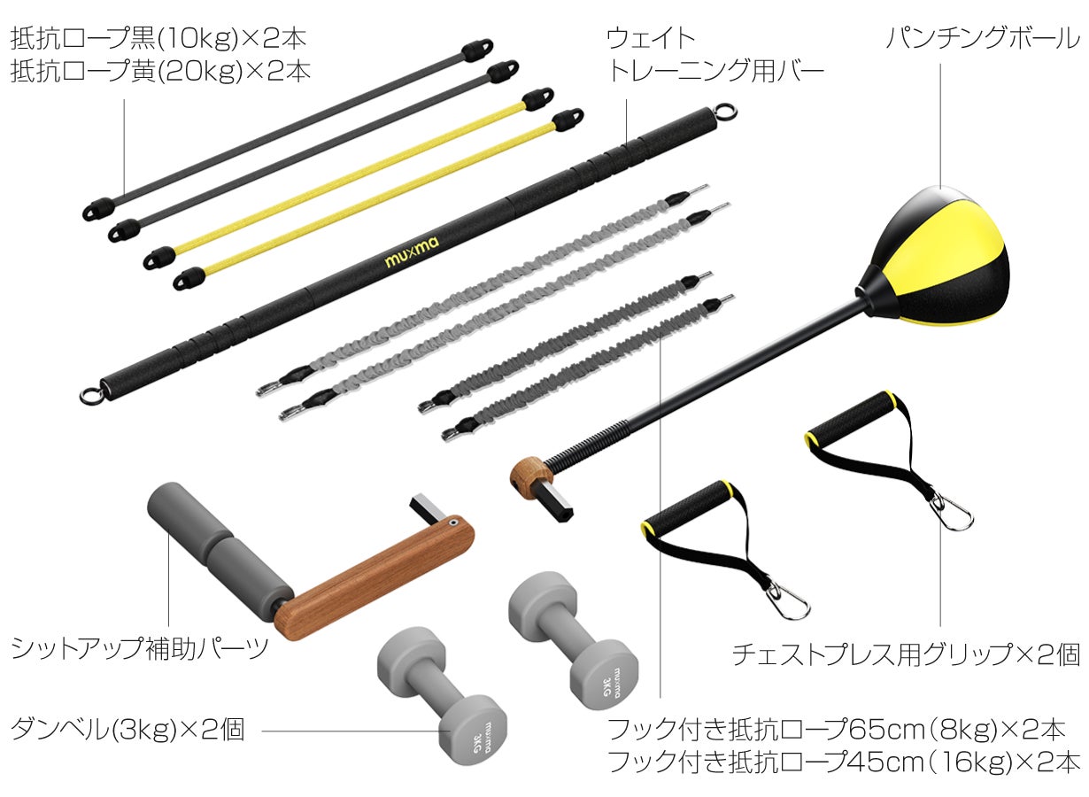 本体に15種類のフィットネスアクセサリーを組み合わせることで、様々な運動が可能。肩・腕・胸・腕・お腹・脚・背中・お尻など全身のほとんどの部位をバランス良く鍛えられます。