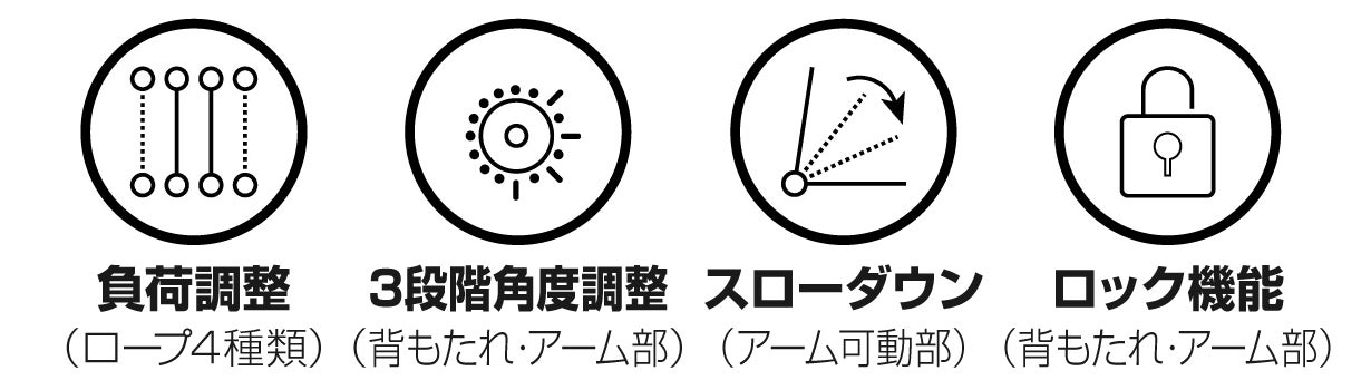 負荷や角度調整(3段階)、スローダウンやロック機能付き。複雑な組立は一切なく、すぐに使えて高齢者や子供でも心地良くトレーニングが可能です。