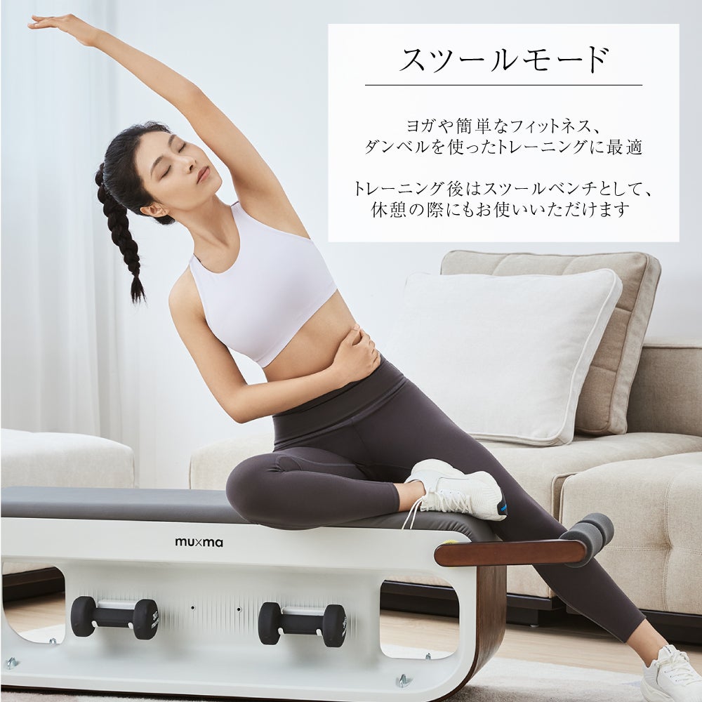 スツールモードはヨガや簡単なフィットネス、ダンベルを使ったトレーニングに最適。トレーニング後はスツールベンチとして休憩時にも使えます。
