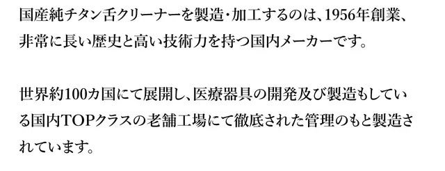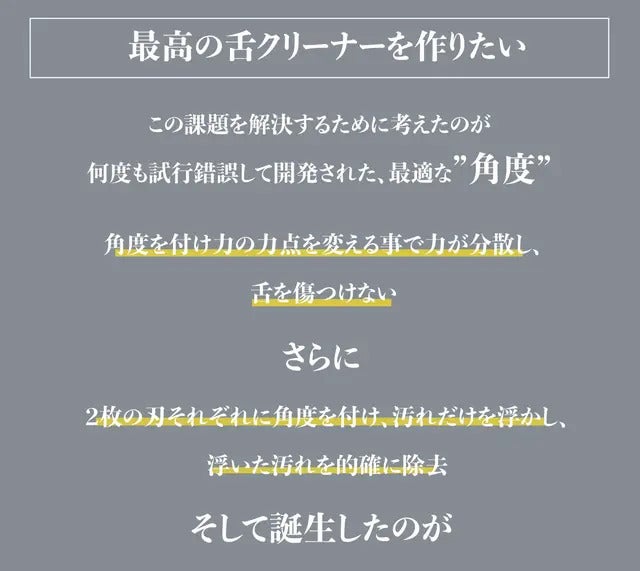 A:内刃の2枚刃のうちの1枚は機械作業に加え、さらに職人による手仕上げでの研磨加工で微細な角度を追加しております。デリケートな舌に触れる部分ですので、非常に微細な加工となっており分かりにくいかもしれませんが、熟練職人の最後のひと手間で微細に確度の違う2枚刃が相互作用をもたらし、優しく汚れを浮かして落とす設計となっております。 なお、仕様の詳細はページ上部の説明文もご参照くださいませ。