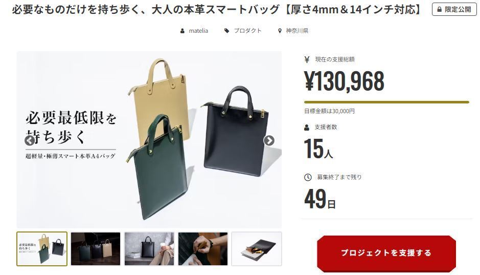 サポーターの皆様この度は皆様からの暖かいご支援誠にありがとうございます。必要なものだけを持ち歩く、大人の本革スマートバッグ【厚さ4mm&14インチ対応】 のプロジェクトがついに始動しました。より多くのお客様にお届けするために、活動を開始いたします。応援のほどよろしくお願いいたします。
