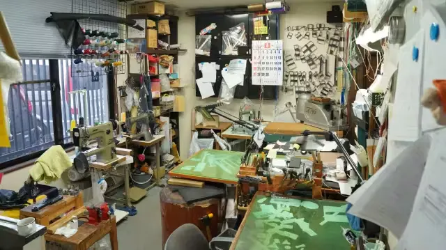 ショップ奥の工房の風景です。金型や各種機材など多岐にわたる道具が並びます。
