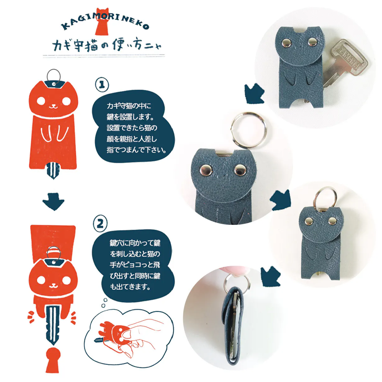 ポケットやカバンに入れ込む鍵。例えば携帯電話や財布と一緒に入れていて、鍵の尖った部分で他のものが傷ついたり、なんて経験はありませんか?鍵をカバーしながら普段の動作をさらにスムーズにしてくれます。かわいいネコのカバーに鍵がすっぽり入り、尖った部分も隠れるので安心です。