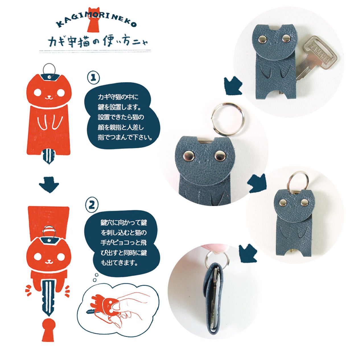 ポケットやカバンに入れ込む鍵。例えば携帯電話や財布と一緒に入れていて、鍵の尖った部分で他のものが傷ついたり、なんて経験はありませんか?鍵をカバーしながら普段の動作をさらにスムーズにしてくれます。かわいいネコのカバーに鍵がすっぽり入り、尖った部分も隠れるので安心です。