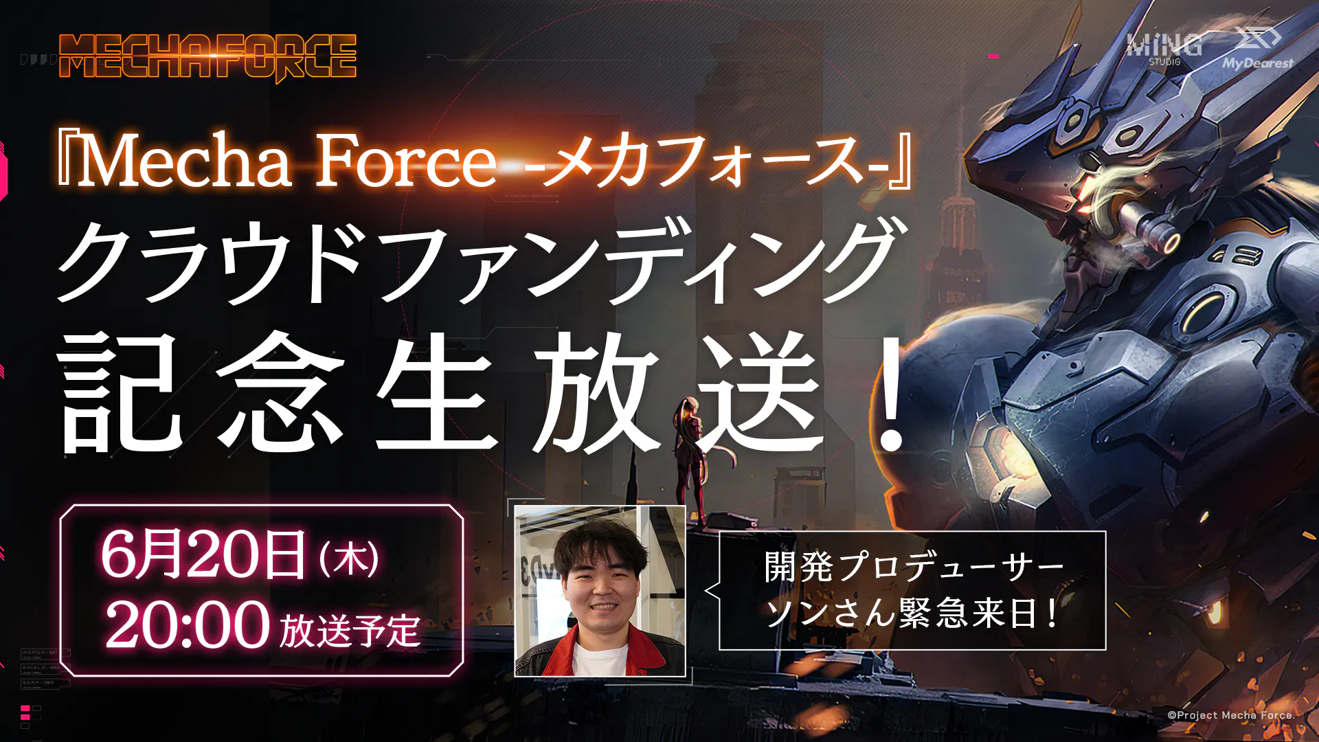 「Mecha Force」のストーリーやゲームシステムなどのゲームの紹介のほか、多数の日本のロボットアニメ作品に影響を受けているソンさんのトークにもご注目ください!!