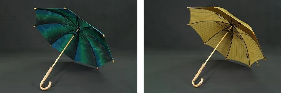 「大島紬の日傘」は、日傘としての機能性と美しさを融合した一品です。鹿児島の大島紬、京都の染屋さんや生地作家さん、今回ご協力いただいた東京都洋傘共同組合さんなど3産地の職人が手を組み、多くの方々のとの共演が実現した事で、バリエーション豊かな素敵な傘が出来ました。しかも1本1本手作りです。UV加工・撥水加工を施し、雨の日でも安心してお使いいただけます。
