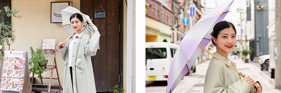 (※本製品は撥水加工を施した晴雨兼用傘ですが、日傘としてのご使用を主としております。激しい雨や長時間の雨傘として使用した際には、雨漏りや色落ちの原因となる恐れがありますので、ご使用をお控えください。)