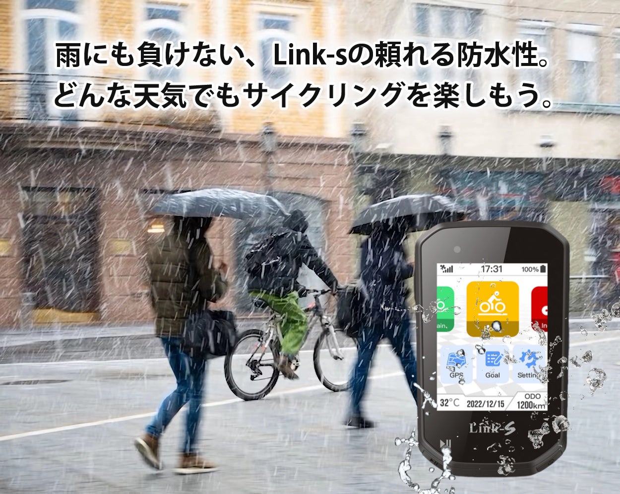 Link-sはIPX6の高い防水です。自然の中でのサイクリングが雨天でも、しいサイクリングになります。