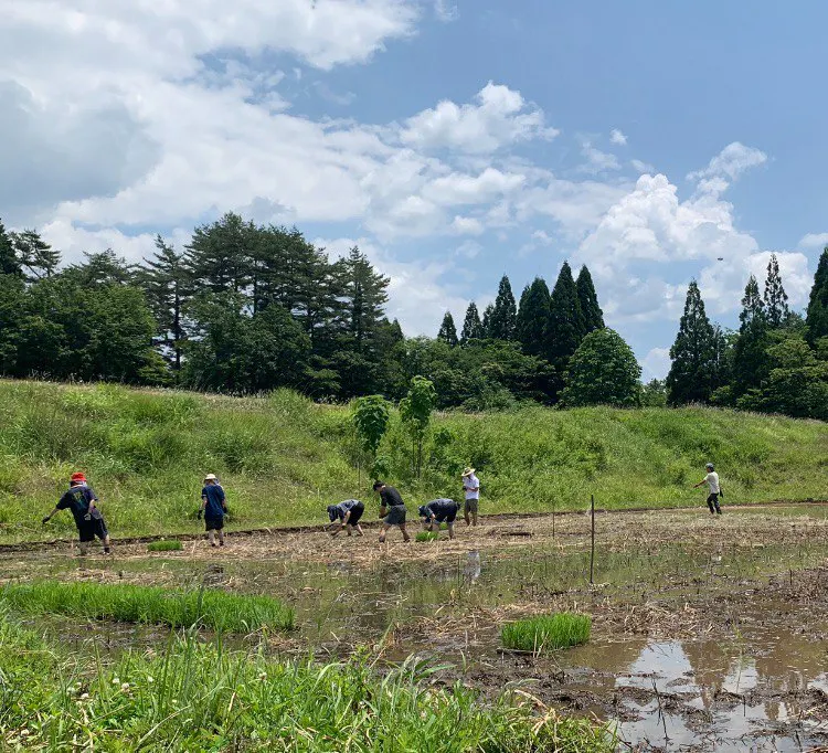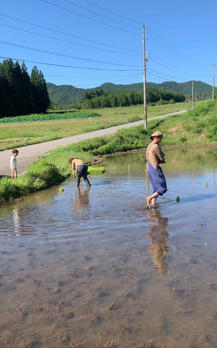 そのため、田植えは半月ほどかかります。その間に関東地域に住む仲間が入れ替わり訪れ、手植え作業を手伝ってくれています。圃場は不耕起栽培(耕さない農法)のため、昨年刈った古い稲株のとなりに新たな苗を植えていきます。