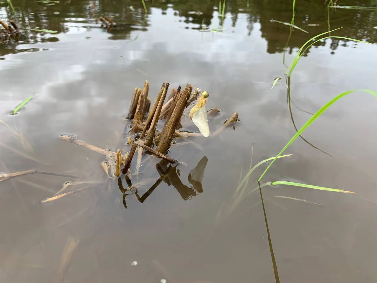 田植えの時期は、トンボの羽化の時期と重なっており、圃場で育ったヤゴが水面から頭を出している稲株に登り、羽化をはじめます。