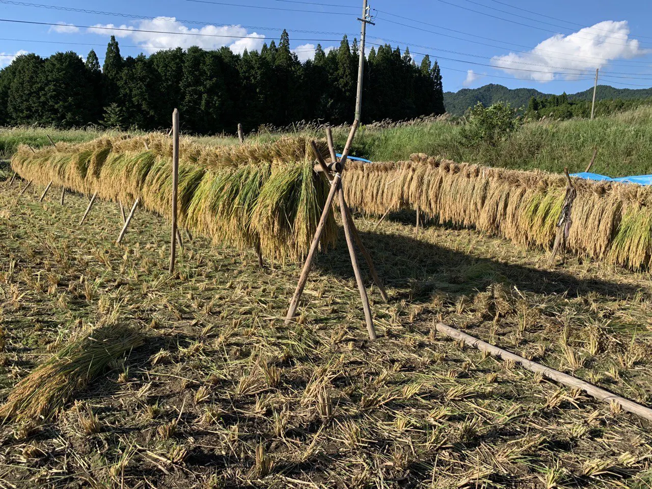 稲を刈ったのちは「はさがけ」をします。支柱をたてて組んだ「はさ」に束ねた稲を交互に掛けて二週間ほど天日で乾燥させていきます。