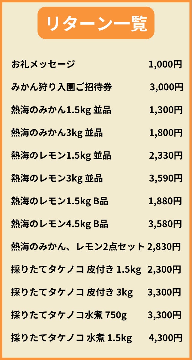 ご協力いただきました金額に応じまして、入園ご招待券、みかん、レモン、タケノコを送付させていただきます。