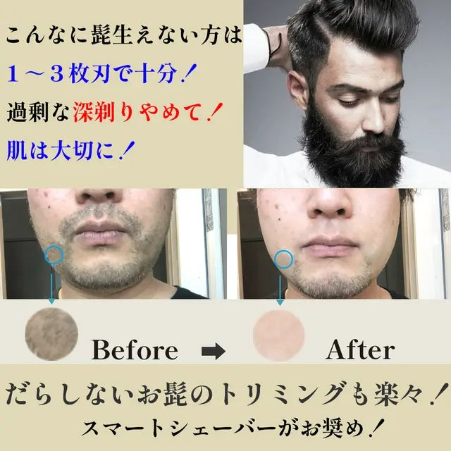 刃を多くする理由はカミソリの刃一枚当たりに掛かる圧力を減らして、肌への負担を和らげるためです。部分的に剃りたい人や毛がそこまで濃くない人、コストを抑えたい人には、刃が少ないシェーバーが(1~3枚刃)で十分なのです。スマートシェーバーが装備している回転式の刃は密着性が高く、剃り負けしにくいのにシッカリ剃れます!もう過度な深剃りは辞めて肌を大切にしましょう!