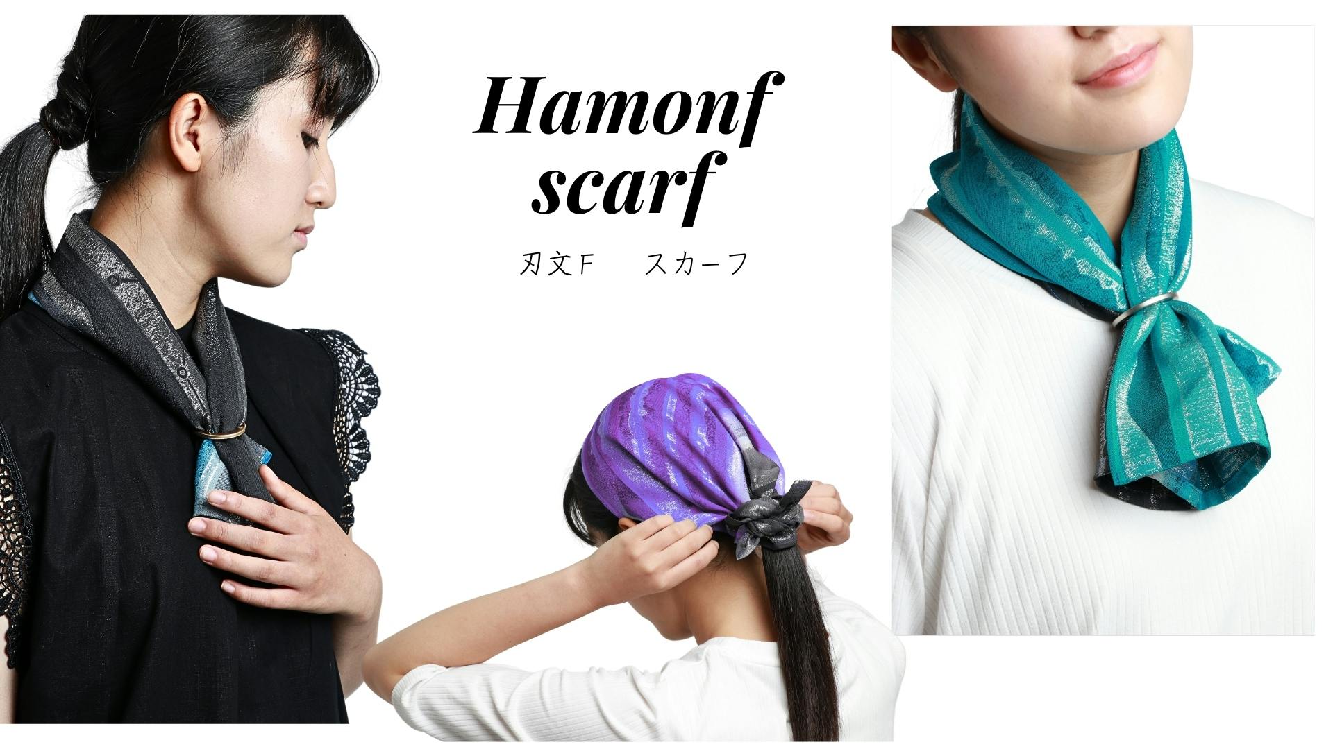 季節の変わり目に首元に巻いて体温調節したり、バンダナや帽子、バッグのチャームなど自分らしくアレンジするファッションアイテム。 ドレスアップや推し色コーディ、あらゆるシーンで活躍する刃文Fスカーフぼかし染で各色5種リターン品にご用意しました。