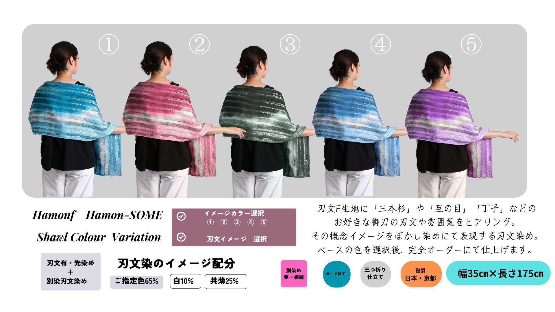 ショールと羽織はお好きな刀剣のイメージや刃文をヒヤリングした上で「刃文染め」加工も対応いたします。