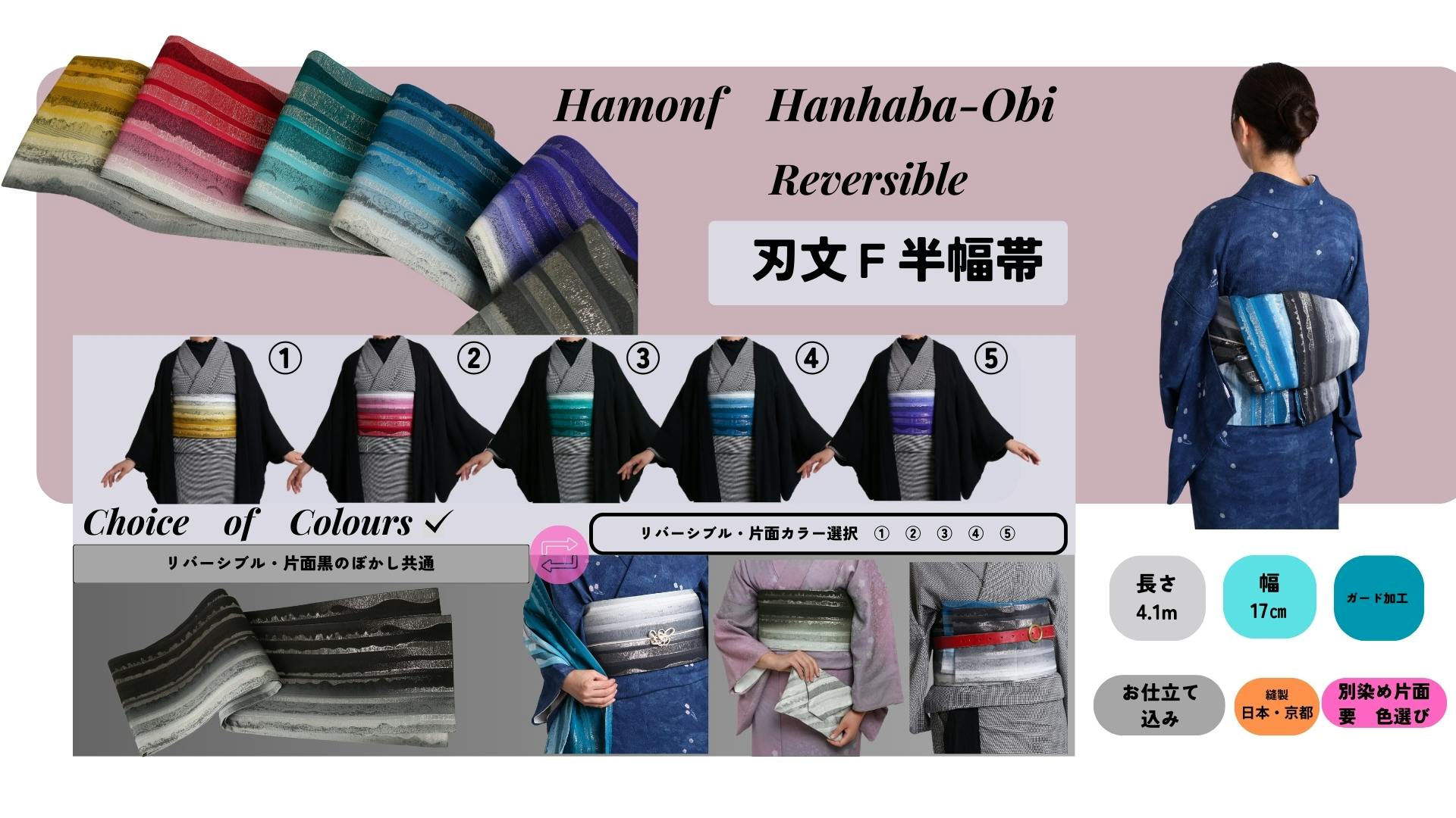 リバーシブル半幅帯の長さは4m10㎝、幅が17㎝。