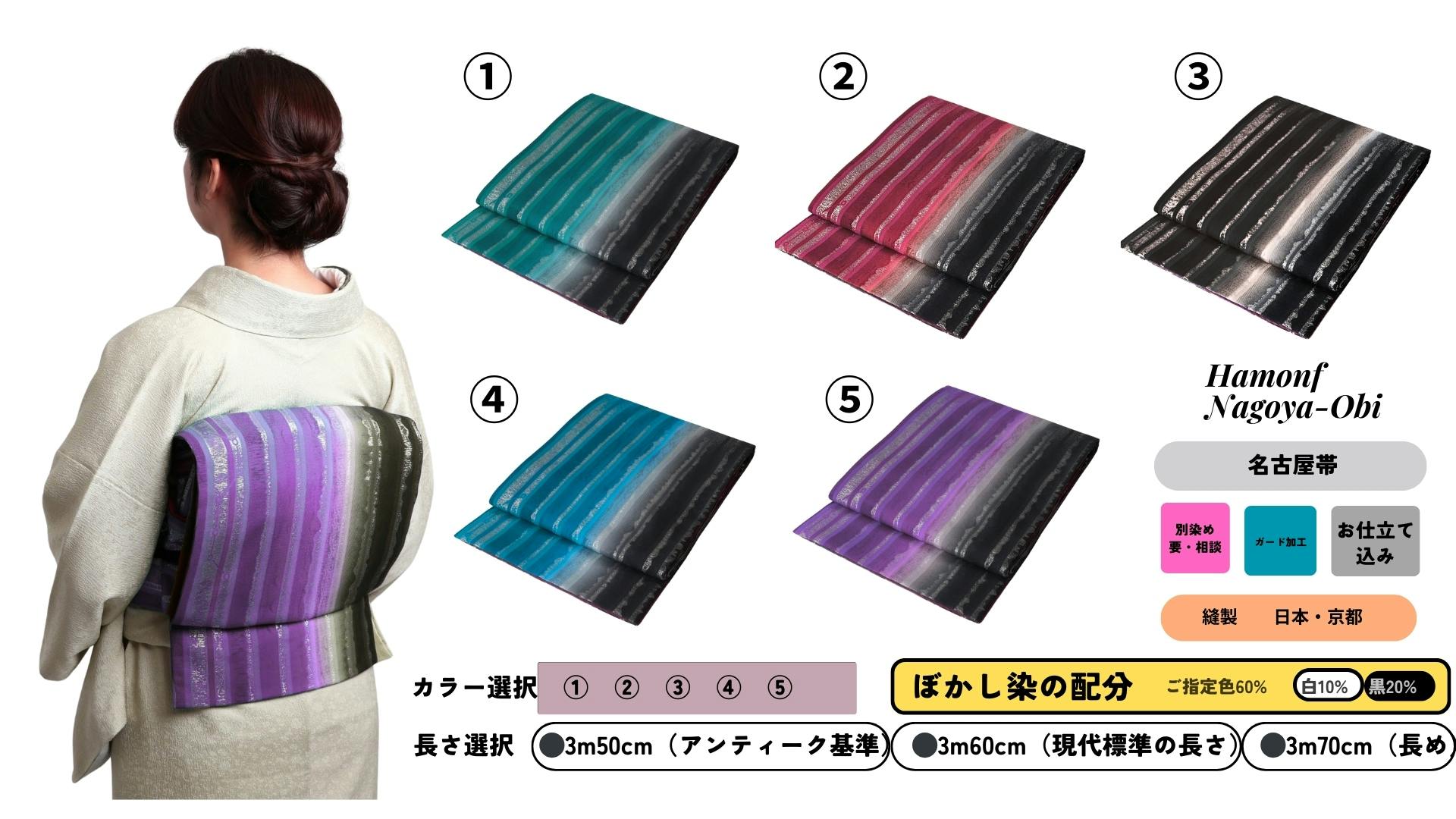 名古屋帯のぼかし染の配分は指定色60% 、白10%、黒20%です。カラー選択①~⑤よりお選びください。