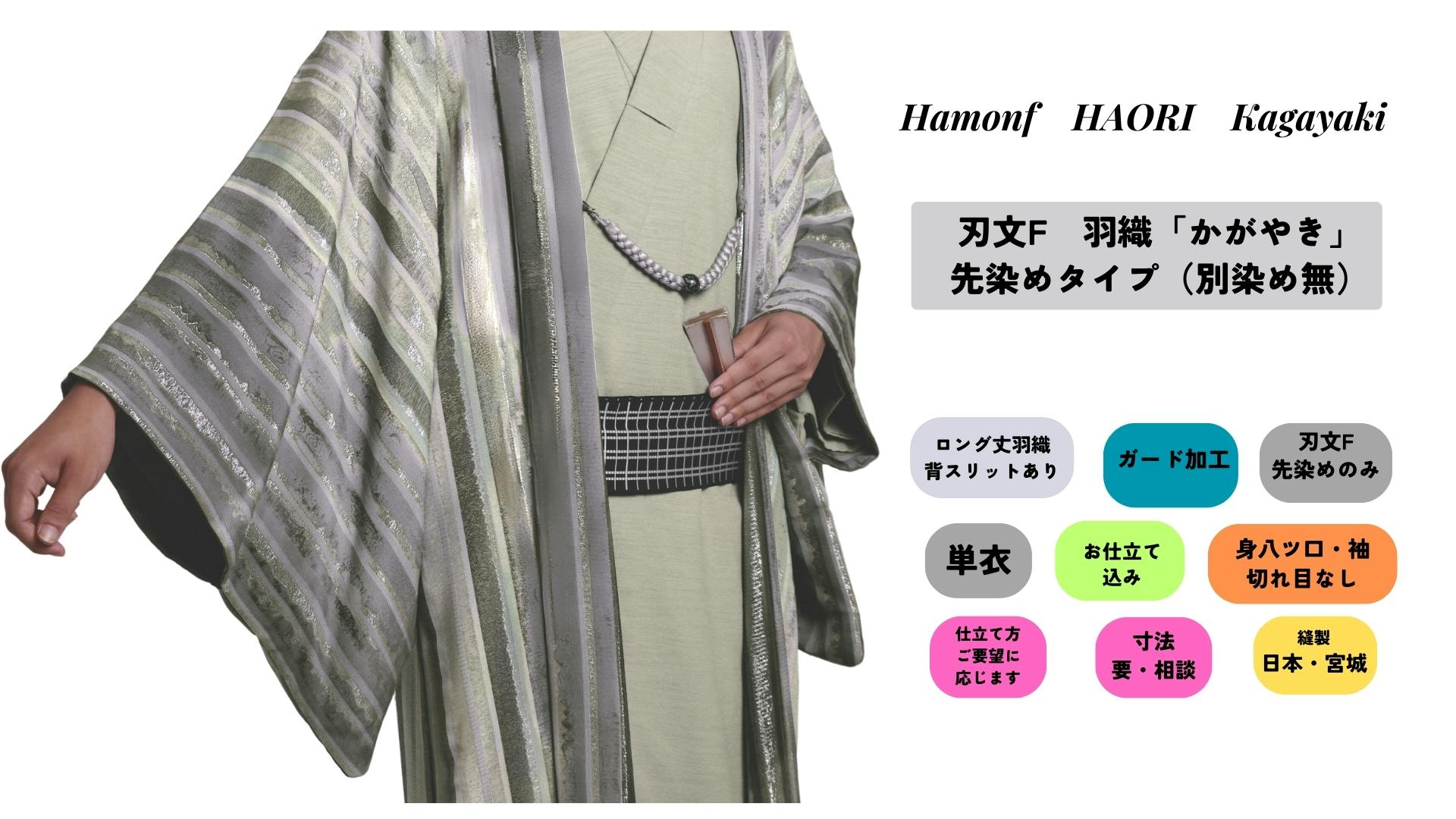 シンプルな先染めの刃文布を使用した羽織「かがやき」は身やつ口の袖切れ目なし。ロング丈で背中にスリットが入り「単衣」仕立てにてお届けいたします。