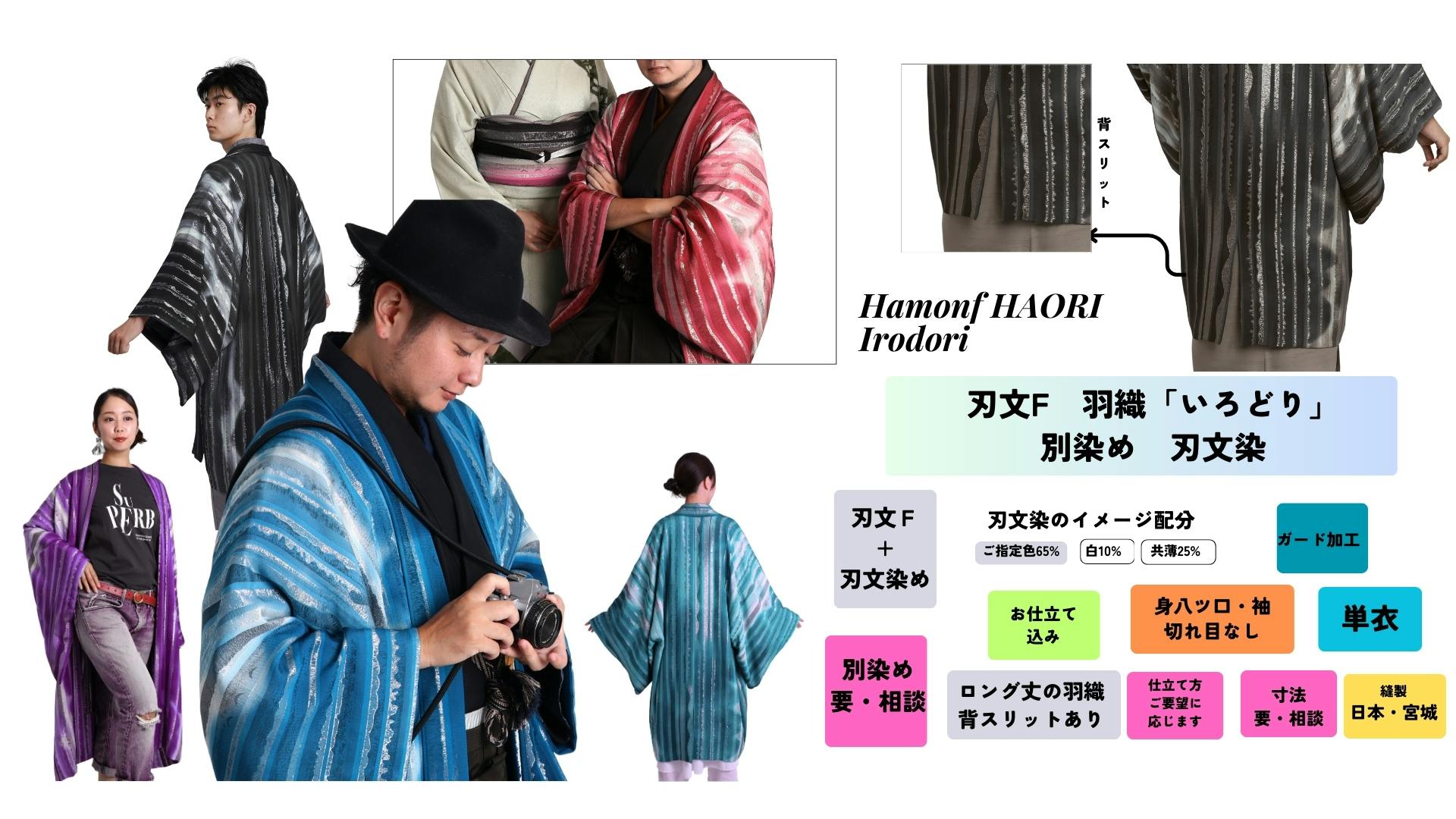 刃文布+刃文染めの羽織「いろどり」は身やつ口の袖切れ目なし。ロング丈で背中にスリットが入り「単衣」仕立てにてお届けいたします。