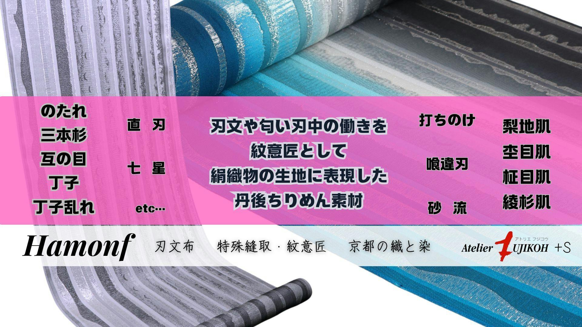 京都の丹後ちりめんの織元「+S」柴田織物様と協業で実現した特殊縫取の紋意匠である刃文布は織のプロと私ども染色工房アトリエ・フジコウの染めのプロが創りあげるこだわり仕上げ。