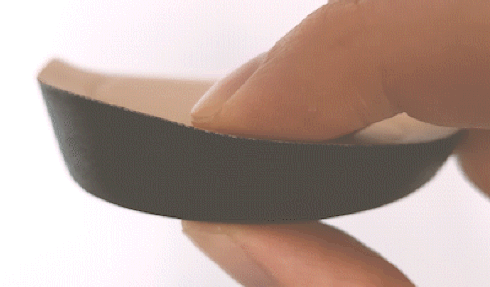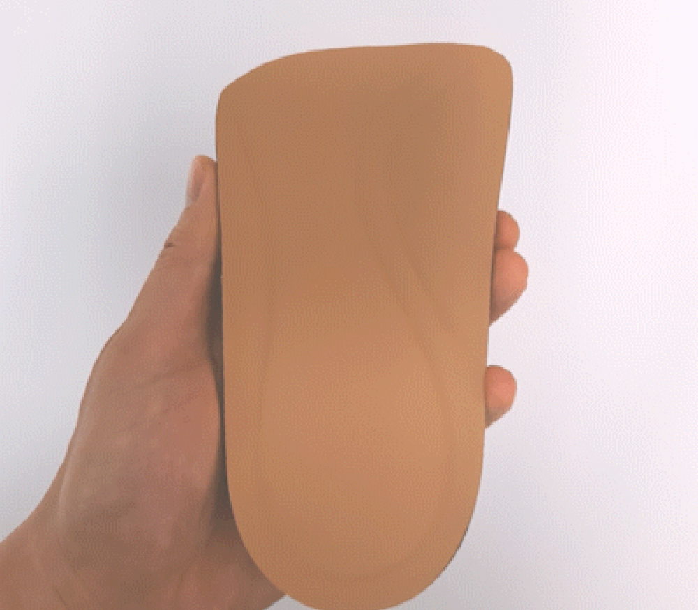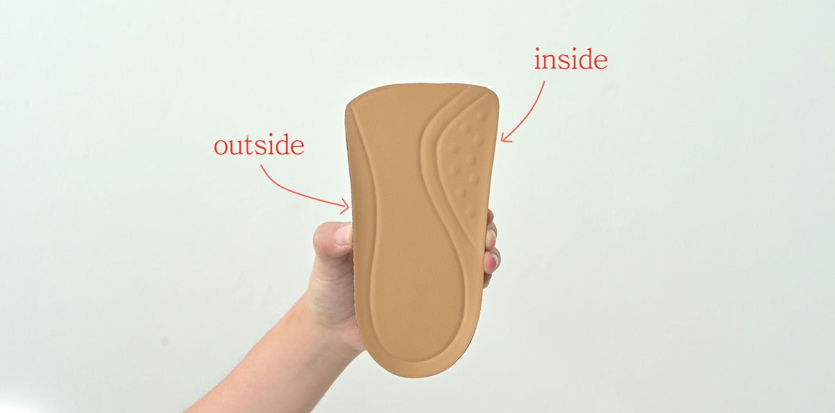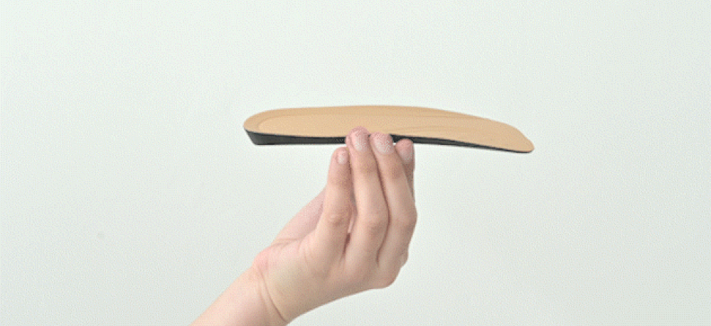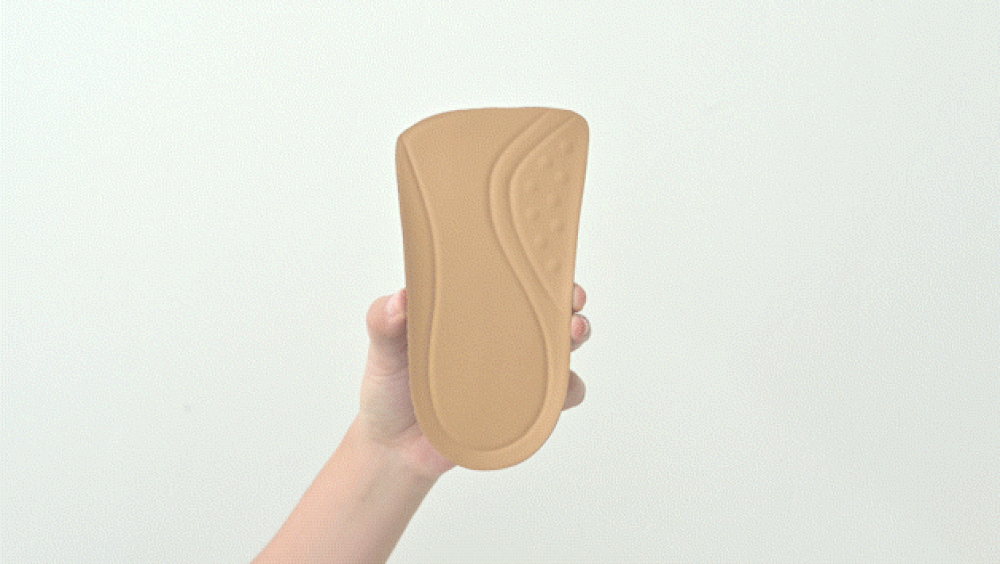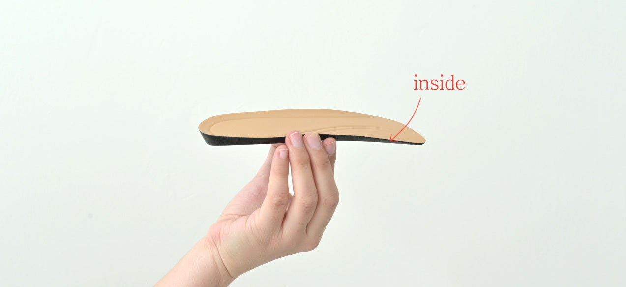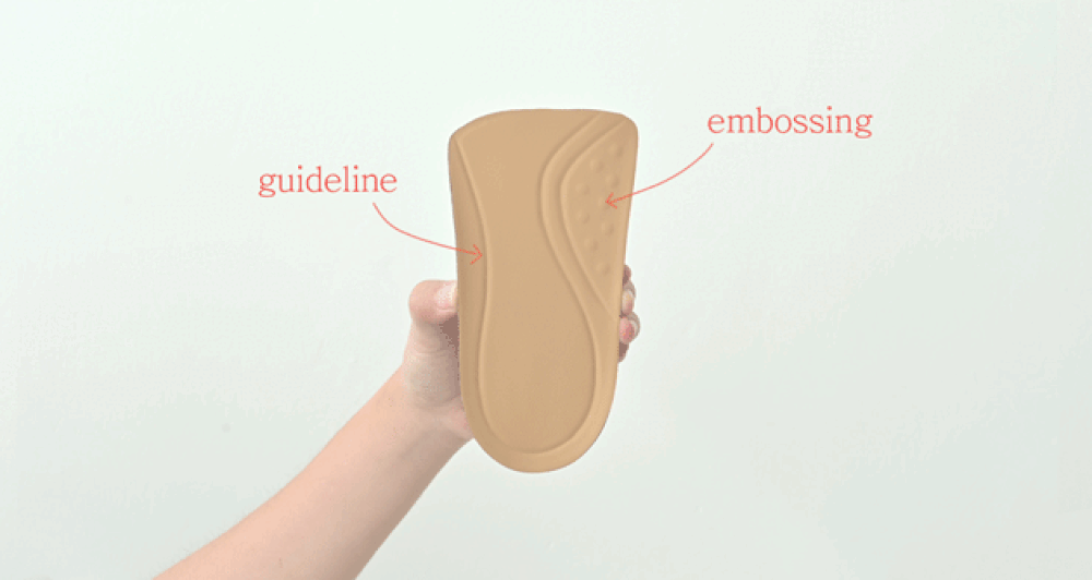 <9°インソール>は、かかと用インソールの短所であるインソールの固定力を克服するために、ゲル両面テープで一度固定し、更に靴の形によって折れ固定力を高めるガイドラインで、インソールを支えられるよう開発しました。