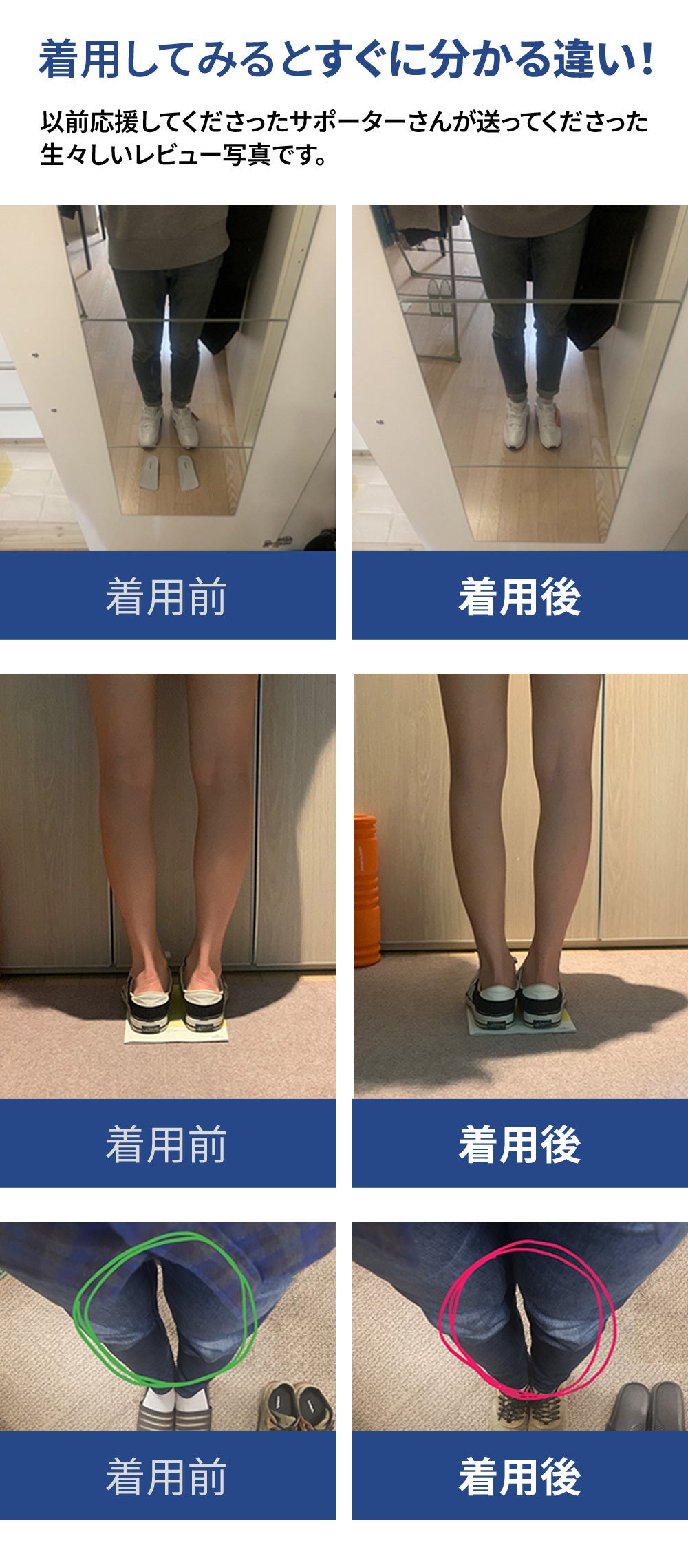 2回のプロジェクトで、2000人の方の応援で着用後に変化を感じるメリットを写真で送ってくださいました。 O脚着用後に一度に変わることはありませんが、崩れたバランスを返すことから始めてみてください。 (長期間の着用をお勧めします。)