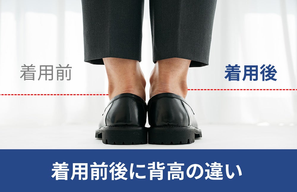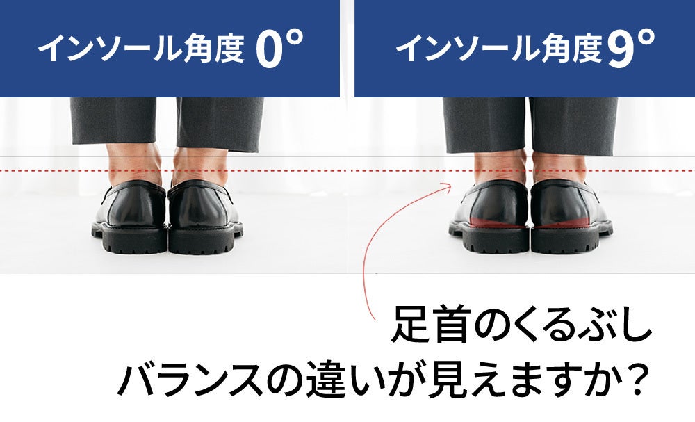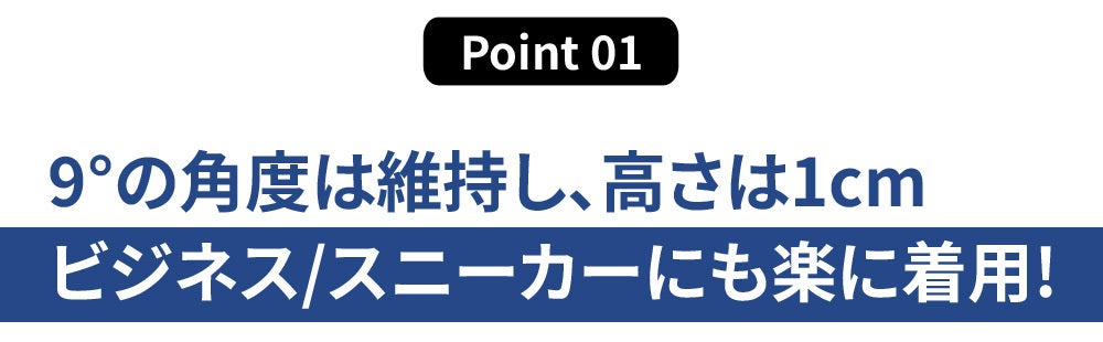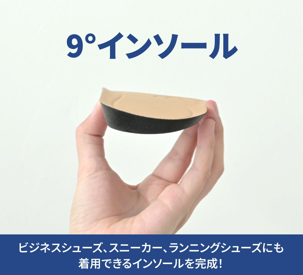 サポーターの皆様の要望に、新しいアイデアを得て、背高機能は抜き、9°バランス機能だけを維持してビジネスシューズ/スニーカーにも着用可能な1cmのバランスインソール「9°インソール」を開発いたしました。