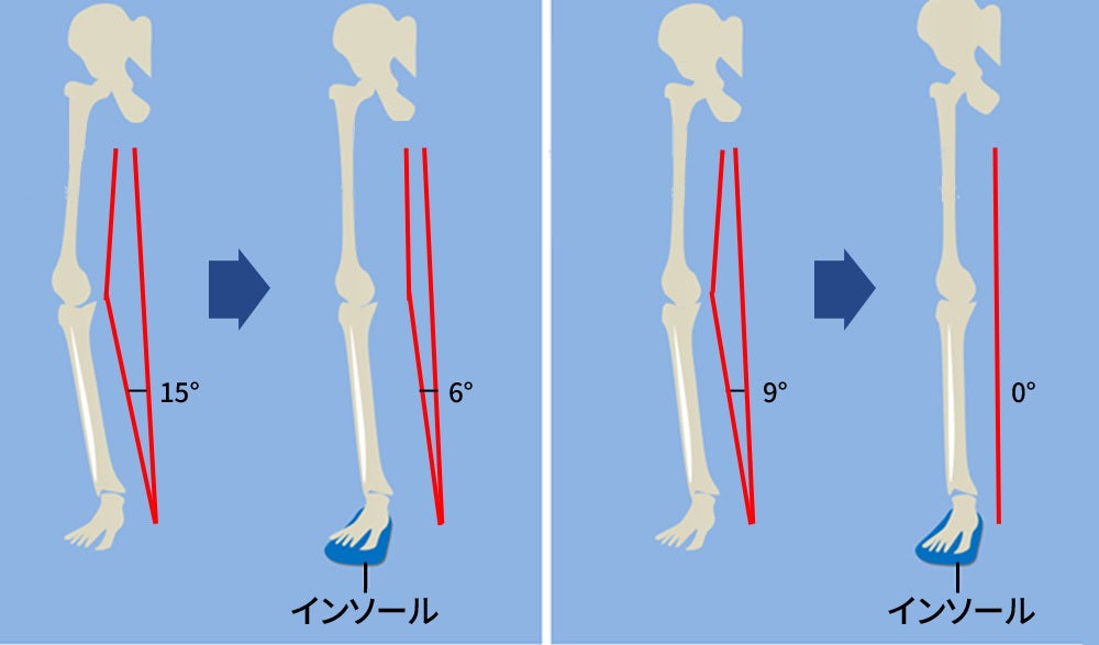 例えば、O脚の角度が激しい15°で測定された方が9°のインソールを着用すると、6°までしか校正できないという意味です。もしO脚が9°で測定された方であれば、9°のインソールを着用すると0°まで変わることがあります。
