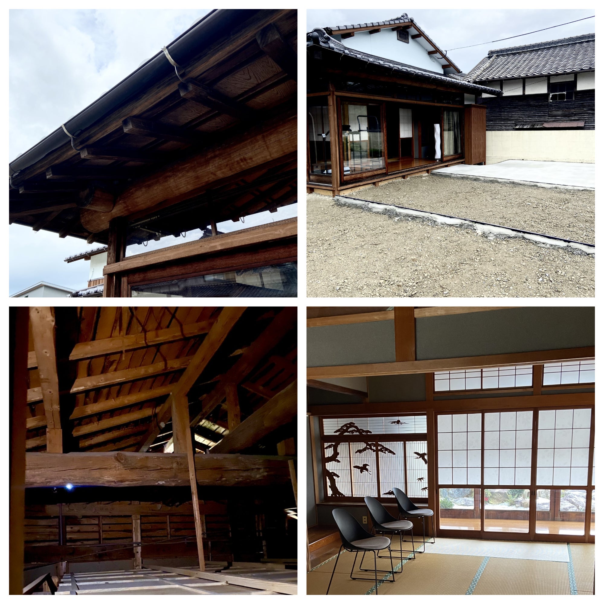 取得時~現状の様子:外構の土間打ち/天井裏の梁(むき出しにする予定)/軒部分/書院造