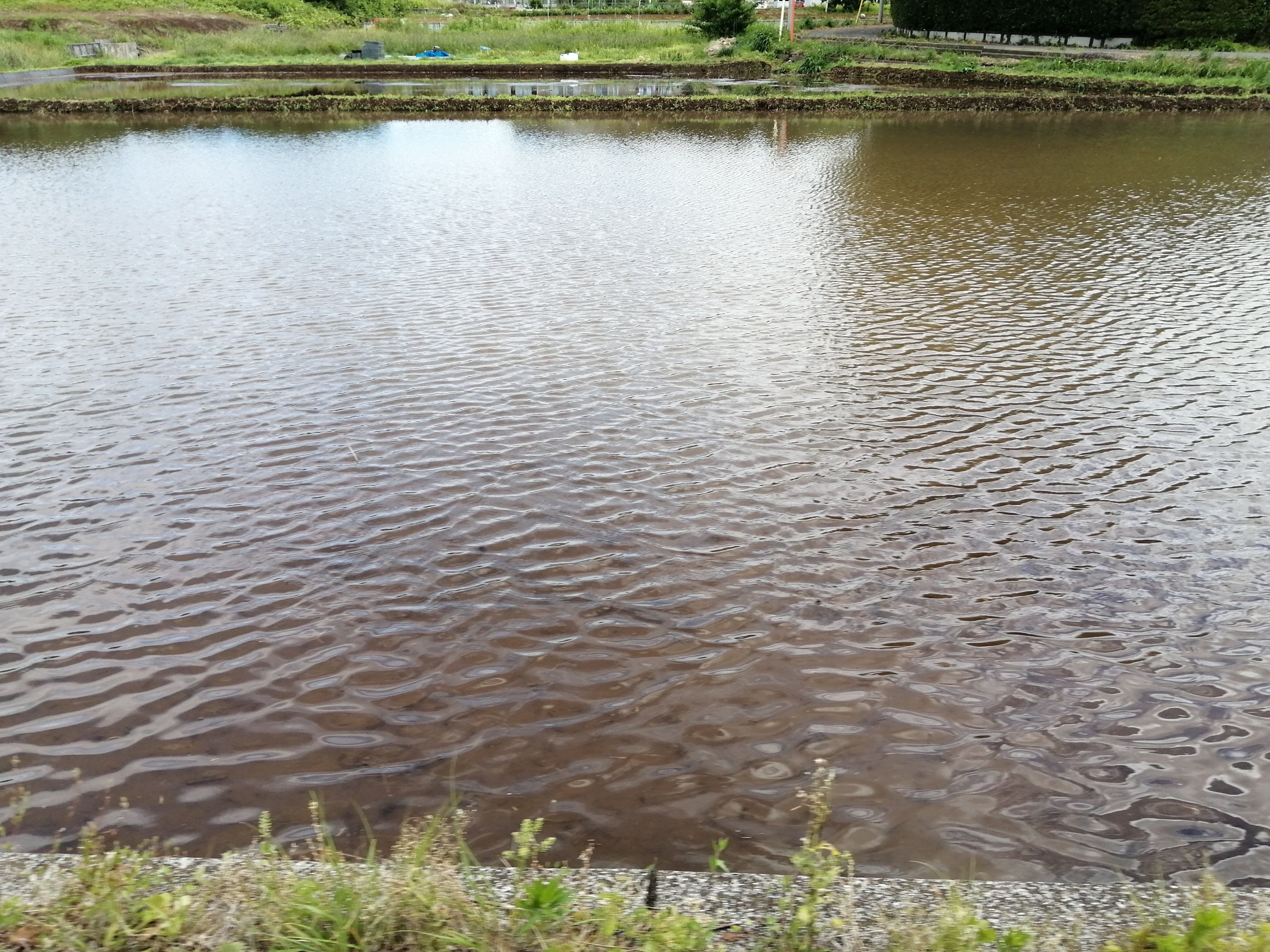 田んぼプロジェクトのクラウドファンディング目標額の45%を達成!見積より安くJA委託費の請求(植える面積分で計算)のおかげもあり支払い資金分いきました\(^o^)/皆さま、ありがとうございます!現在、田んぼの藻の対応や草取り、田んぼに入れる水の調整に苦戦中です(写真:藻を落ち着かせるために水を止めた田んぼ)