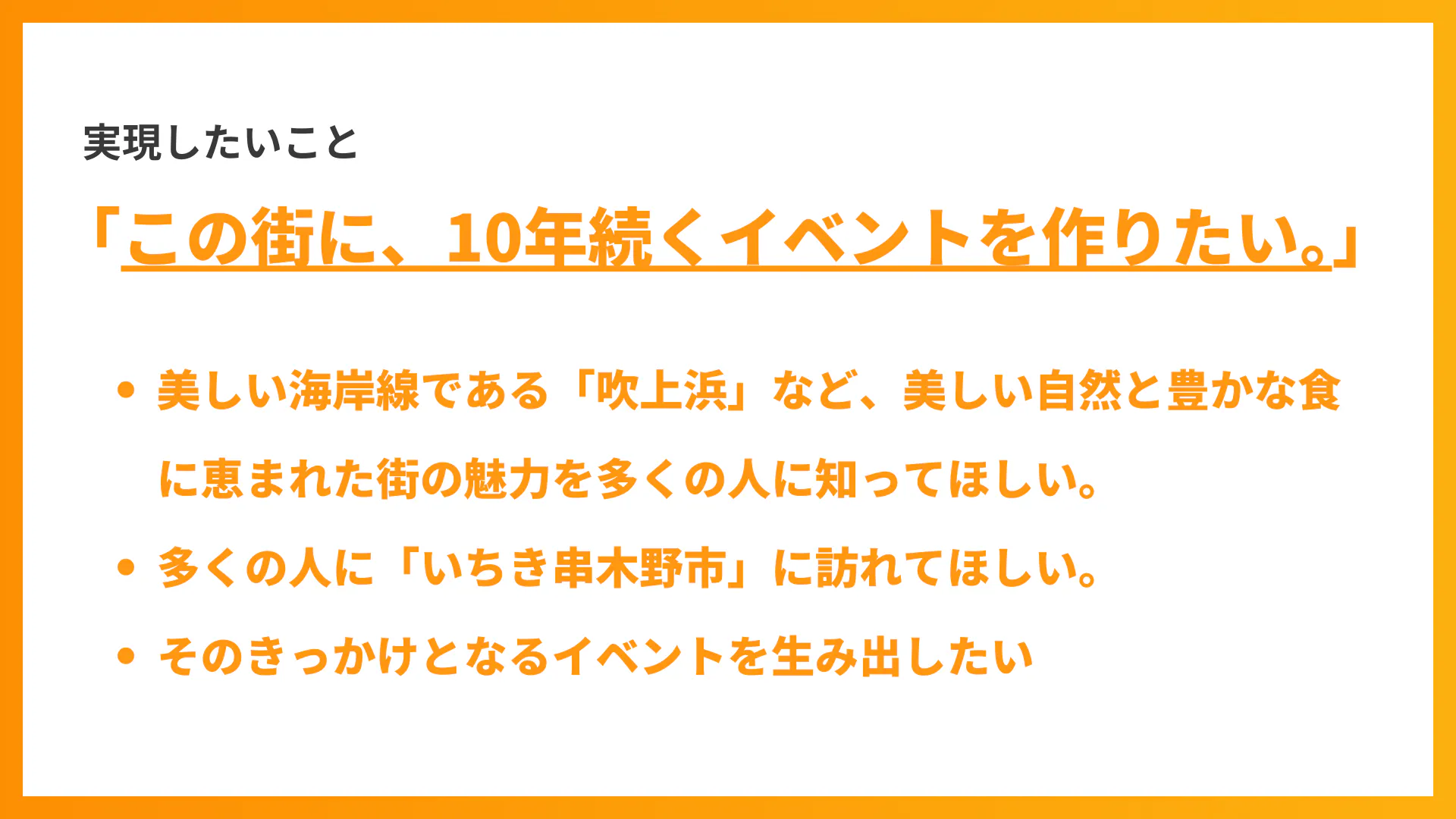 イベントを通して、多くの人にこの街に訪れてほしい。いちき串木野市の美味しいものや素晴らしい景観、人の温かみや街の雰囲気などの魅力を、幅広い世代・地域の方に知ってもらいたいと考えています!