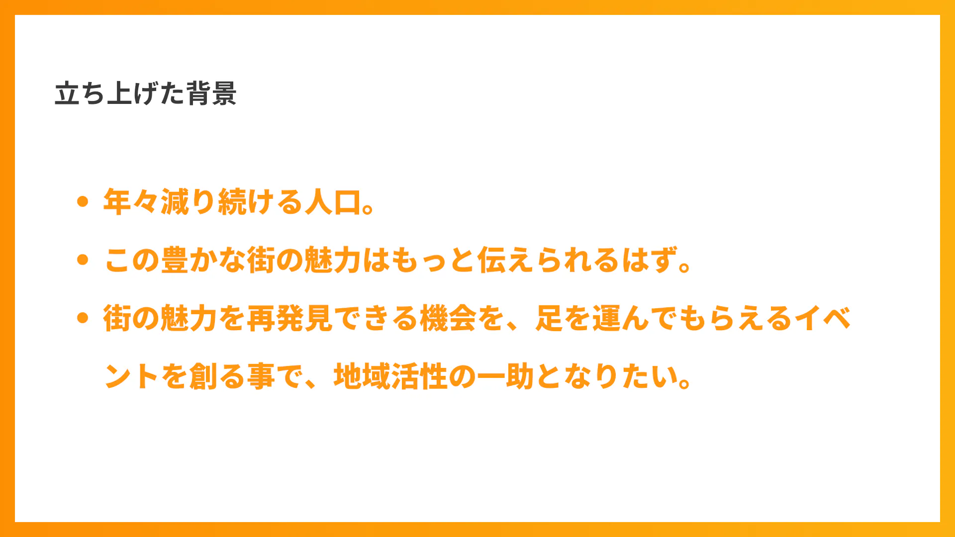 このイベントは、単なるお祭りではありません。私たちの地域が直面する問題を解決するための一歩として、私たちの町を盛り上げるために、皆さんの力を借りたいと思っています。