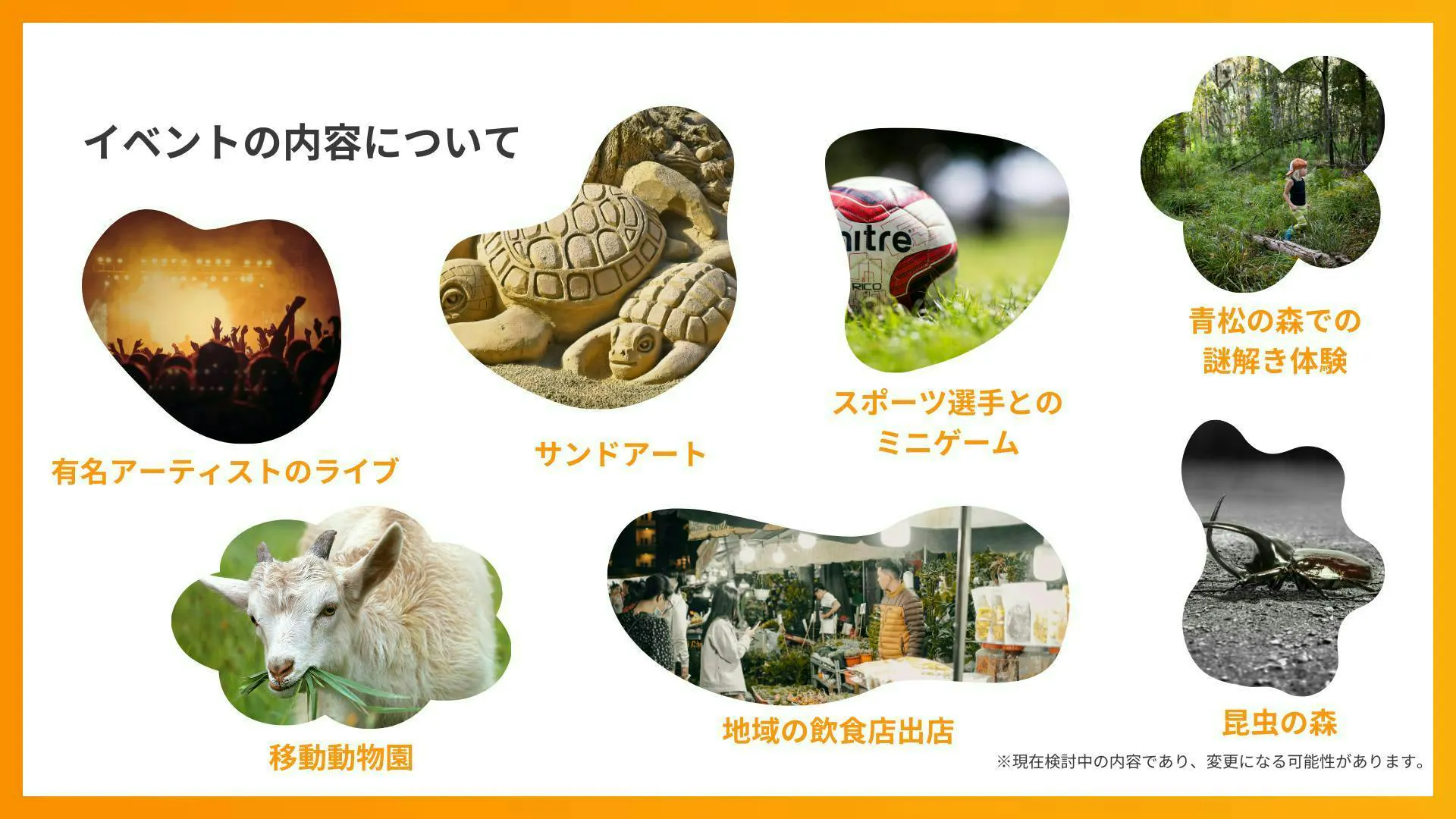 いくつものコンテンツをクロスジャンルに混ざり合わせ、地域の特製や特色を活かした構成を考えています。
