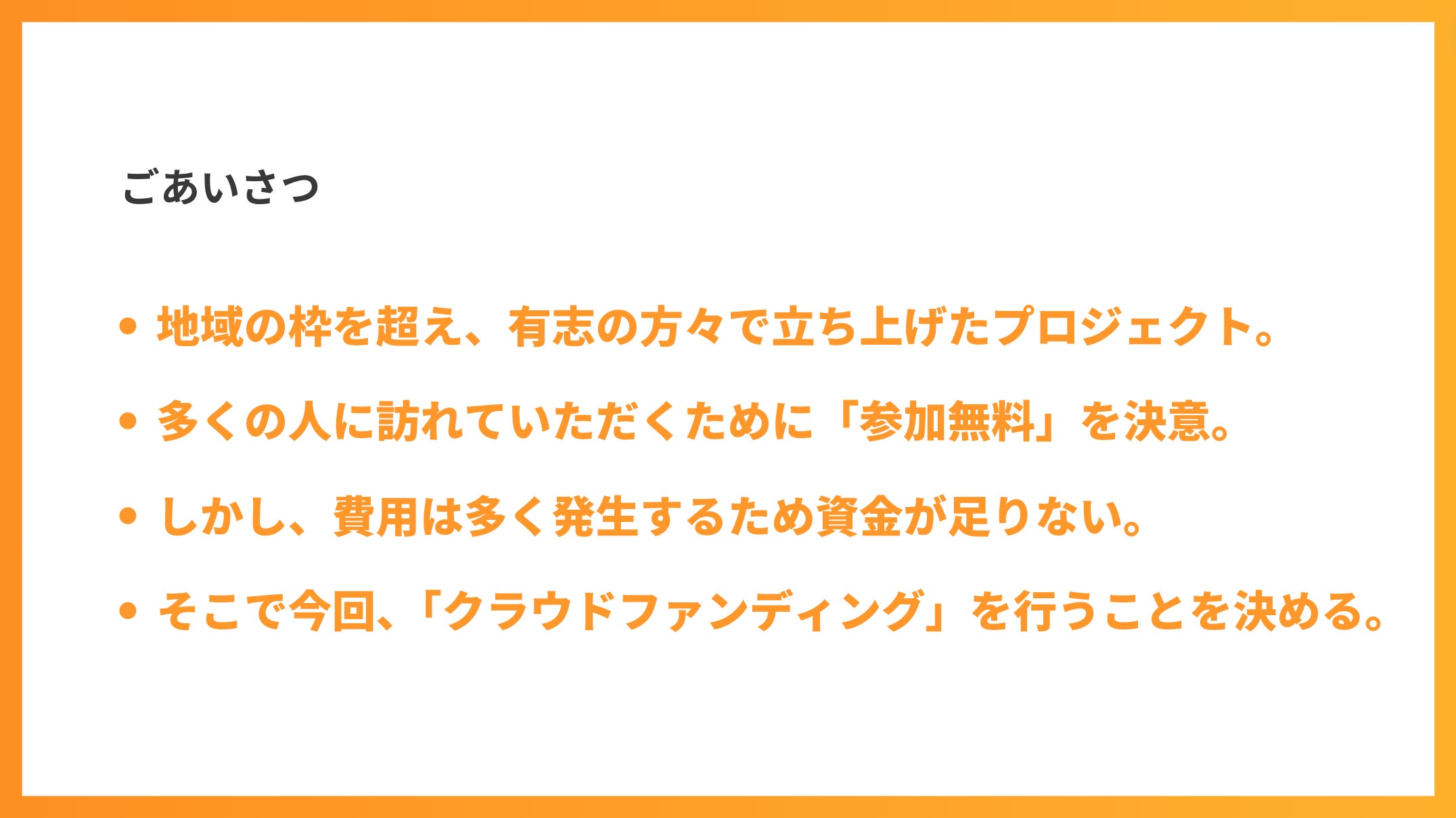このイベントは、単なるお祭りではありません。私たちの地域が直面する問題を解決するための一歩として、私たちの町を盛り上げるために、皆さんの力を借りたいと思っています。