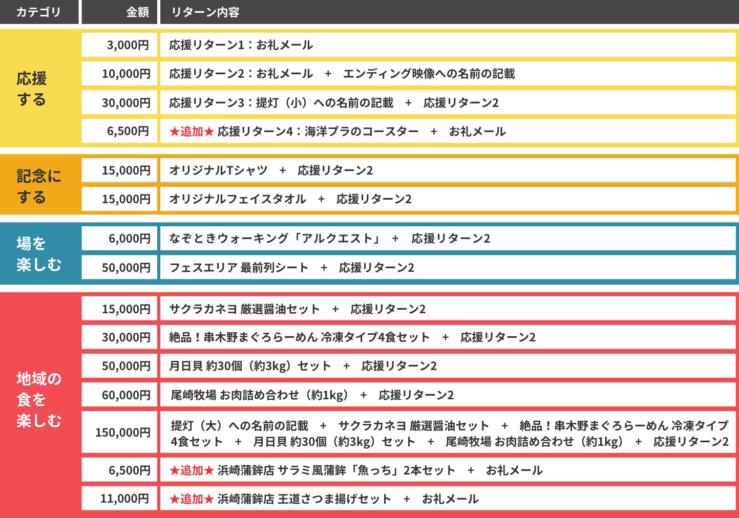 今回、各種コンテンツの資金不足のためのご支援をいただきたいという思いだけでなく、「思い出に残ってほしい」「当日をさらに楽しんでほしい」「いちき串木野市や吹上浜に関わる特産品をより多くの人に届けたい」という想いで、リターンを用意いたしました!