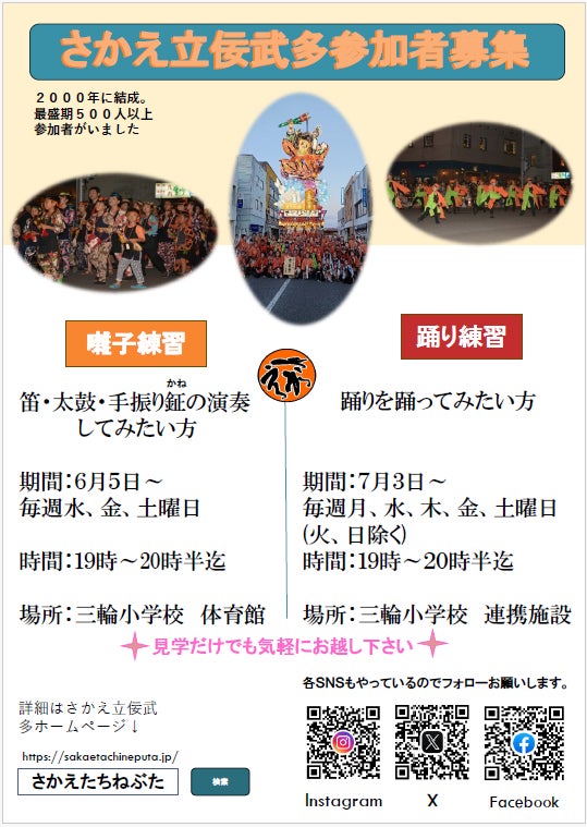 私たち、さかえ立佞武多の目的は、地域の児童・生徒に、郷土の誇りである立佞武多の制作・囃子・踊りを継承し、後継者の育成を図り、伝統を後世に伝えるとともに、会員相互の親睦と地域社会貢献に資する事を掲げています。