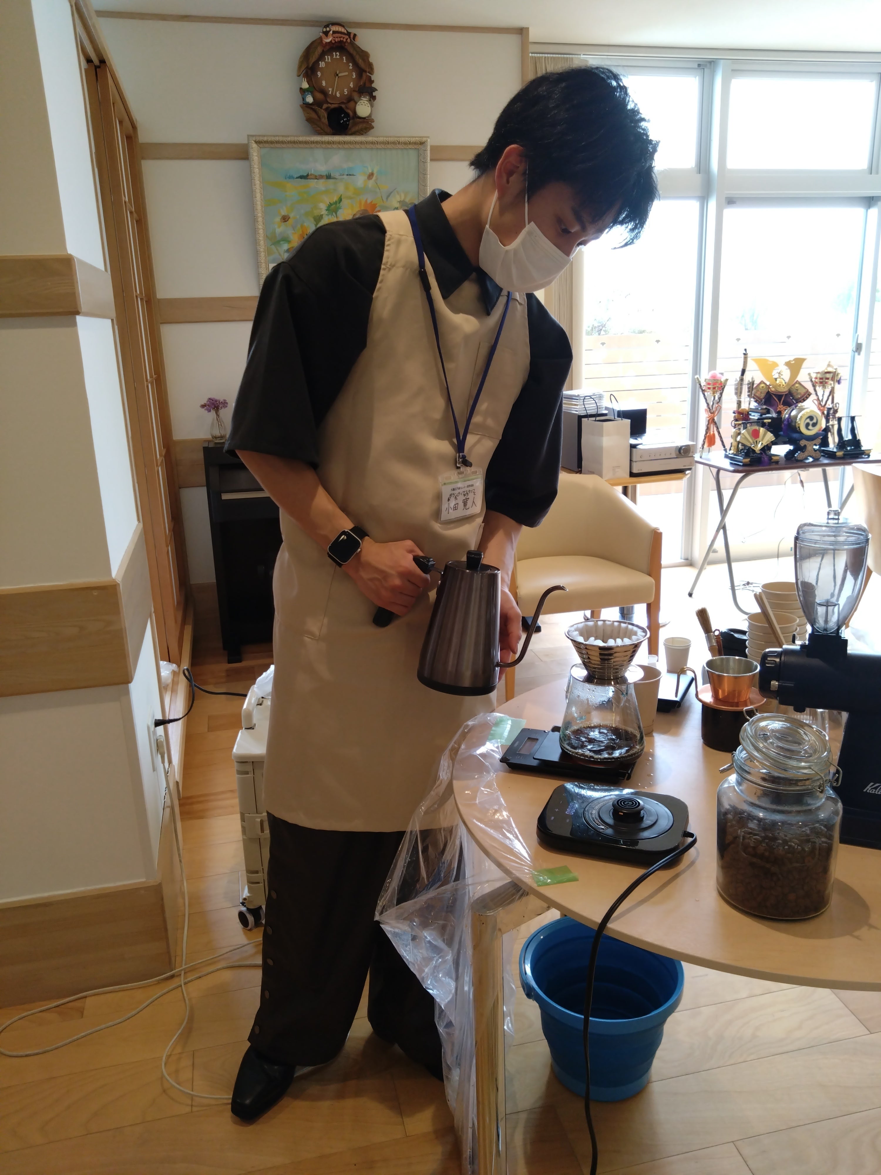 毎月1回、大学のコーヒー研究会と共に緩和ケア病棟へのコーヒーサーブを行っております。患者さんの中には動くことが出来ない方もいらっしゃいますので、病室にミルとドリッパーを持ち込みコーヒーをサーブしております。病室にはコーヒーの香り広がり、患者さんの顔にも笑みこぼれ、以前に喫茶店にコーヒーを飲みに行っていた頃の話や子供達がいる時は自分がコーヒーを淹れていた話などで、とても懐かしく、嬉しそうに語られていました。淹れてる私達も笑顔になります。