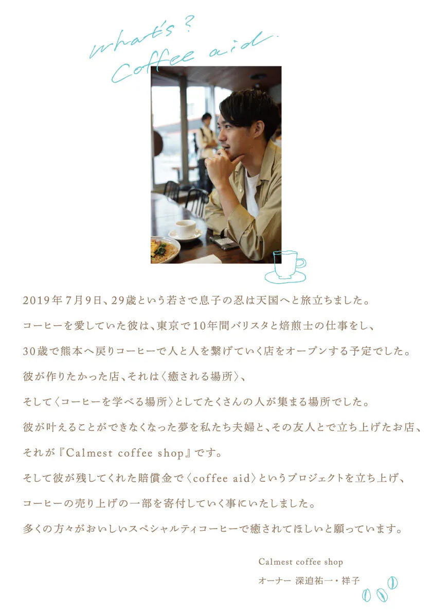 身近な人が事件や事故で被害に遭うということは暗くなりがちでナイーブな問題ですが、コーヒーという飲み物を通して、残されている遺族が、生きている意味を問い前向き生きていくことを考えていただかればと思っています。