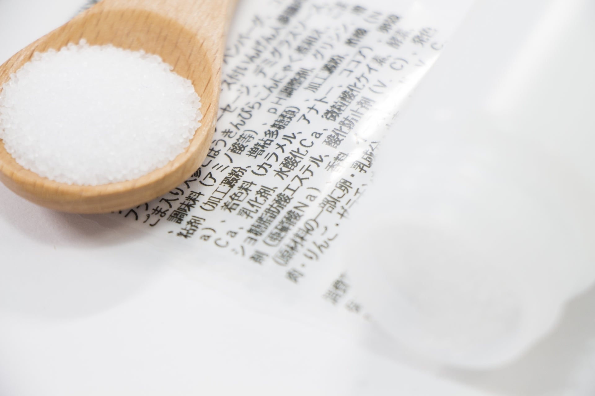 代表的なもののひとつが、アスパルテームやスクラロース、アセスルファムKなどの人口甘味料。商品中のカロリーを抑えたり、風味を加える目的で配合されています。