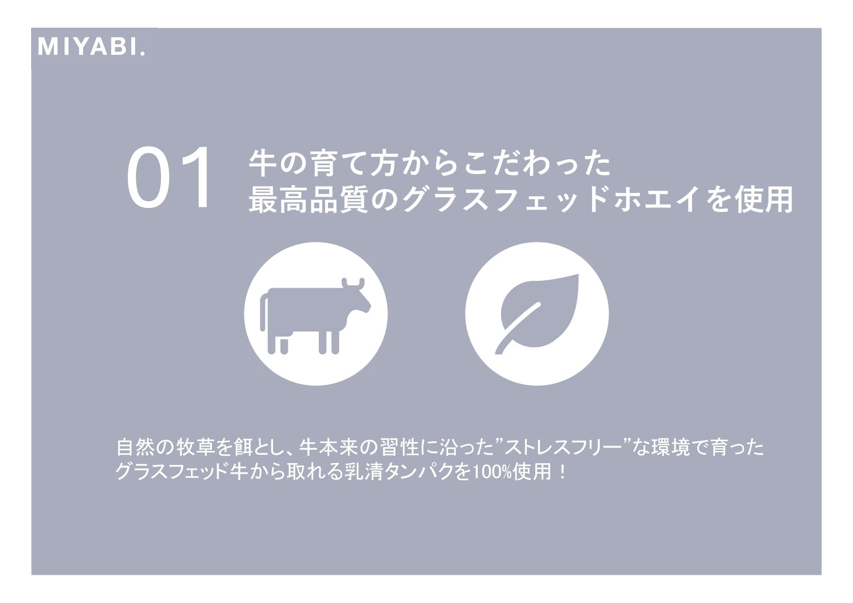毎日のプロテインに、グラスフェッドホエイから作られたプロテイン【MIYABI.】をぜひ、お選びください。