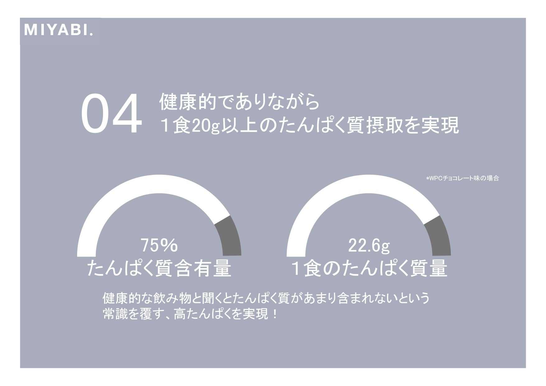 【MIYABI.】は健康的でありながら、1食20g以上のタンパク質摂取が可能です。健康的な飲み物と聞くとタンパク質があまり含まれないという常識を覆す、高たんぱくを実現しています!