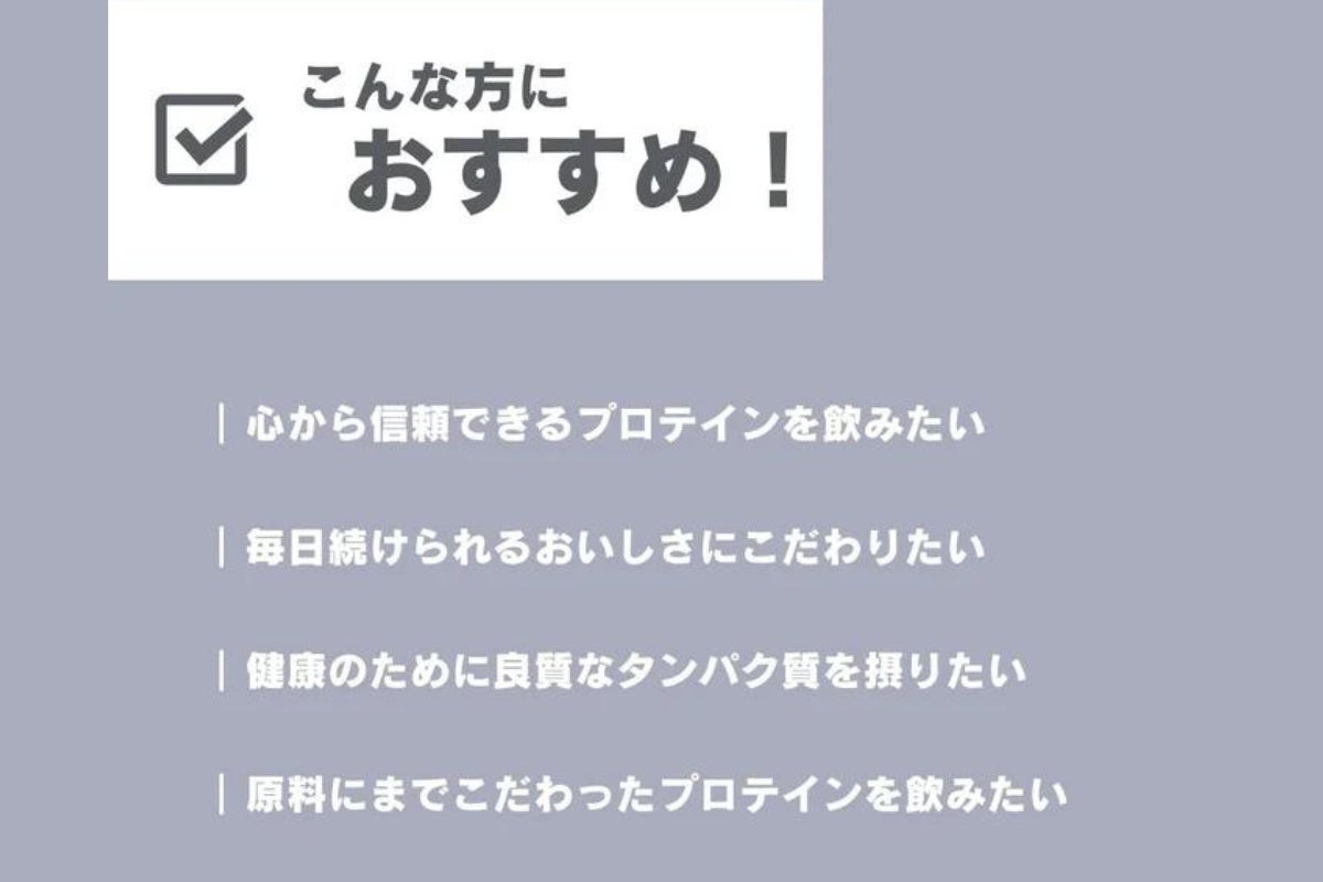 心から信頼できるプロテインを飲みたい方、毎日続けられるおいしさにこだわりたい方、健康のために良質なたんぱく質を摂りたい方、原料にまでこだわったプロテインを飲みたい方…健康に気を使うすべての方に、おすすめです。
