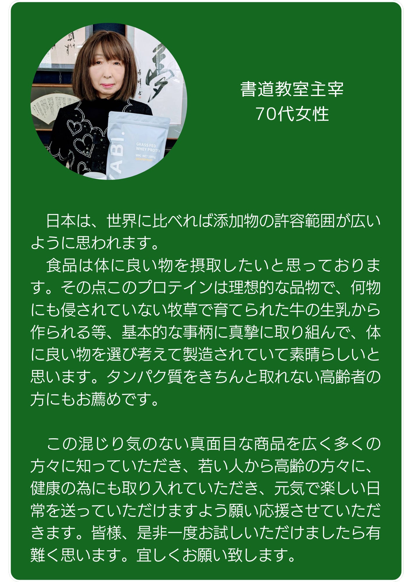 加えて「どこよりもおいしいプロテインを作りたい!」との思いから、手に入る限りのグラスフェッドプロテインをすべて試飲し、そのどれよりもおいしいと思う味わいに仕上げました。一度飲んでいただければ、その良さが確実に伝わる自信があります。