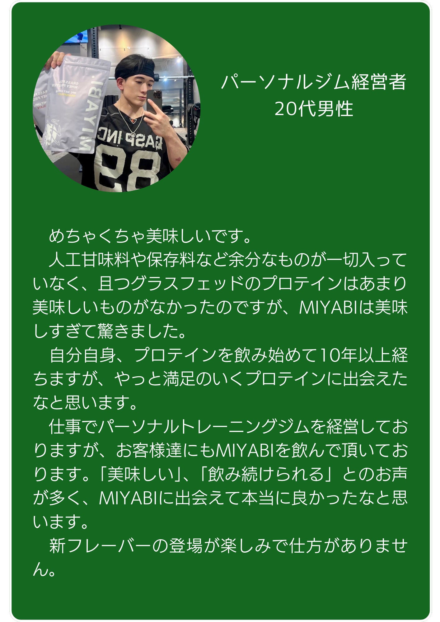 グラスフェッドプロテインを扱っているメーカーは他にもいろいろありますが、【MIYABI.】の一番のおすすめポイントは何よりおいしいこと!【MIYABI.】は、どのメーカーのグラスフェッドプロテインよりもおいしい自信があります。