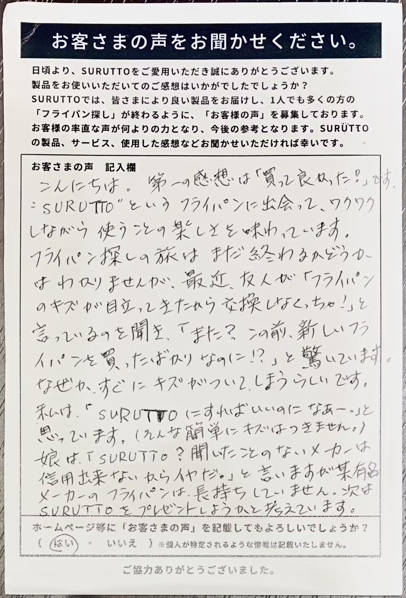 SURUTTOを手にした全てのお客さまが感動し、「やっと出会えた!これこそが私の求めていたフライパンだ!」と満足できる最高のフライパンでなければ、意味がない。