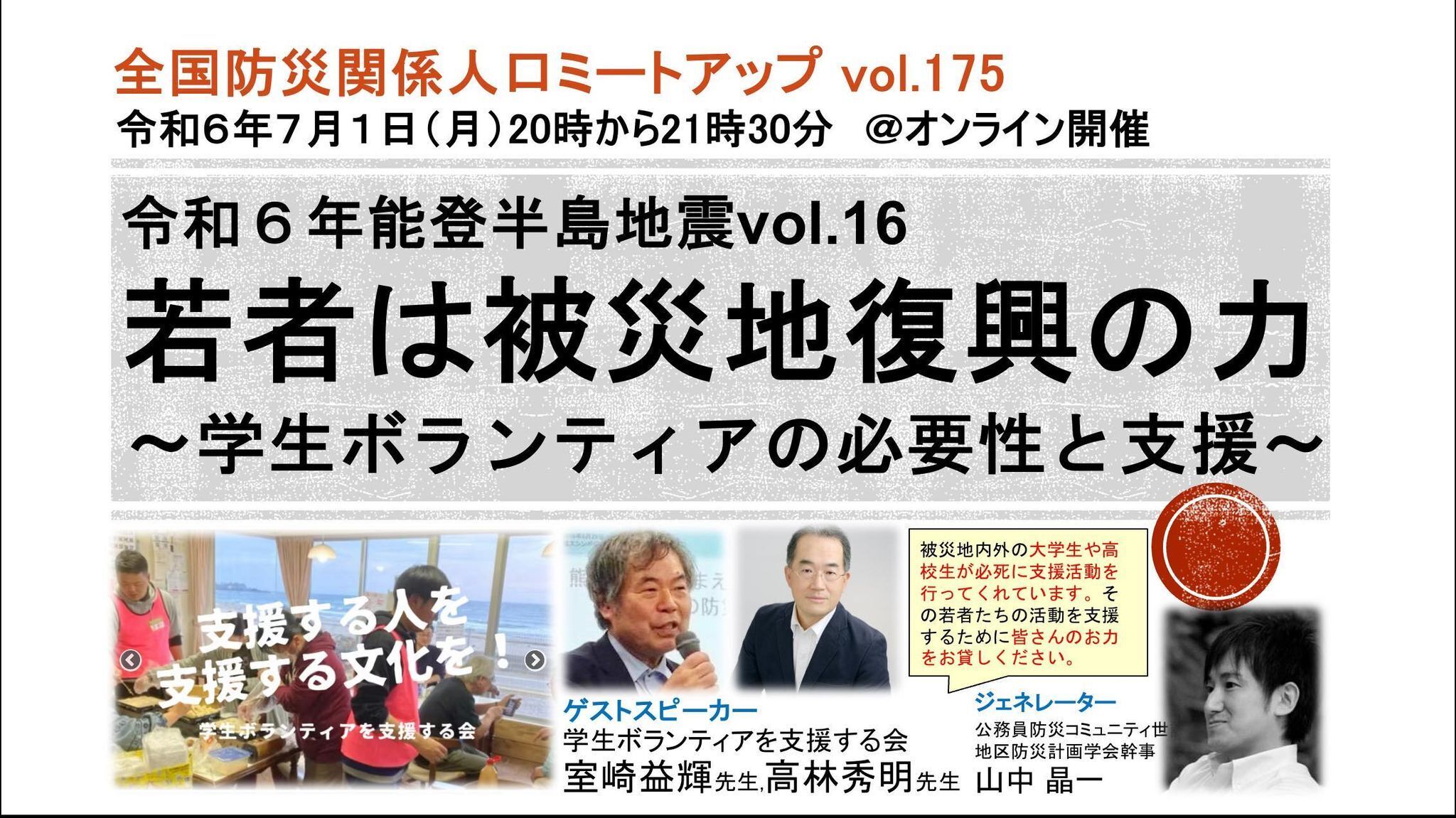 通算175回目となる7月1日(月)は「能登半島地震vol.16 若者は被災地復興の力〜学生ボランティアの必要性と支援〜 」として、学生ボランティアを支援する会の代表:室崎益輝先生(兵庫県立大学名誉教授)と審査委員会委員長:高林秀明(熊本学園大学社会福祉学部教授)に話題提供いただき、参加者の皆さまと共に考えます。
