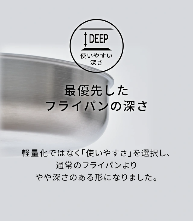 しかし、浅いフライパンと深いフライパン、どちらが料理が快適に作れるのかを天秤にかけ、「深さ」を維持することになりました。