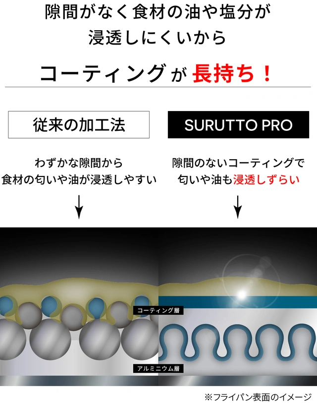 SURUTTO PROに使われる特殊なフッ素コーティングは、抜群のスルッと感が驚くほど長続き!