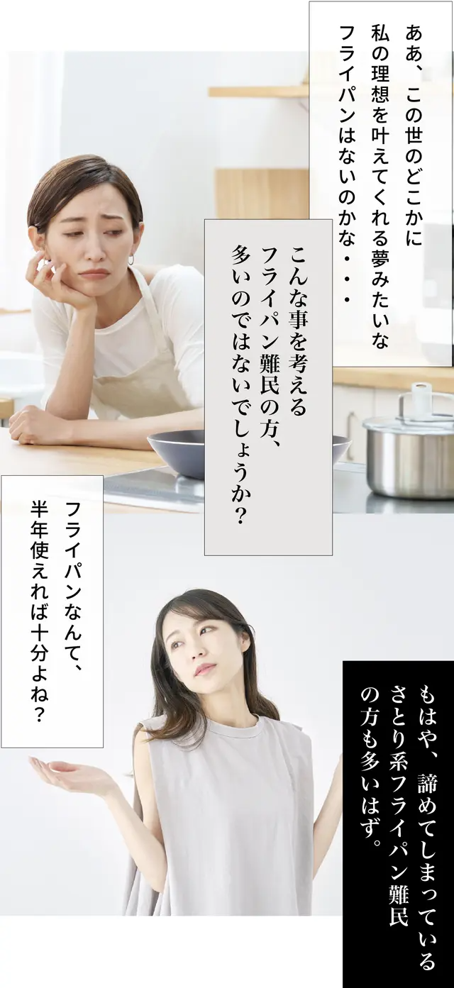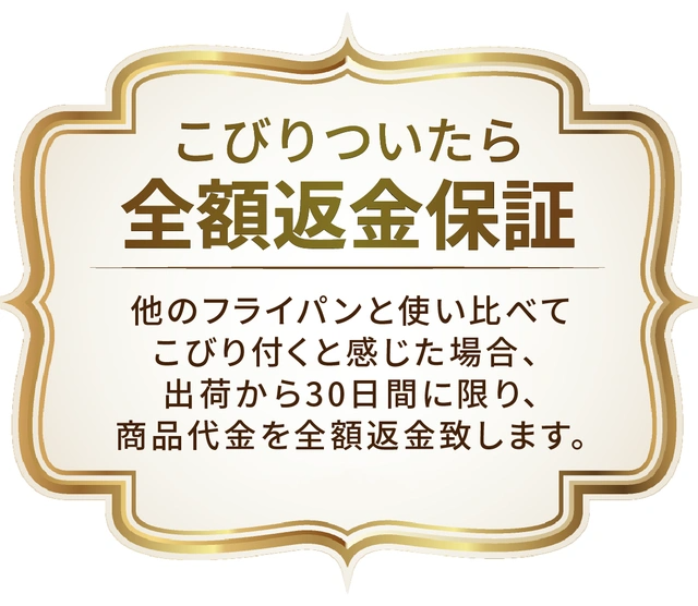 また、購入後には、必ず納得してご使用いただきたいので、もし、実際に使ってみて、「こびりつく」と感じられた場合は、出荷日から30日以内であれば、返品できる「30日間全額返金保証」をご用意しております。