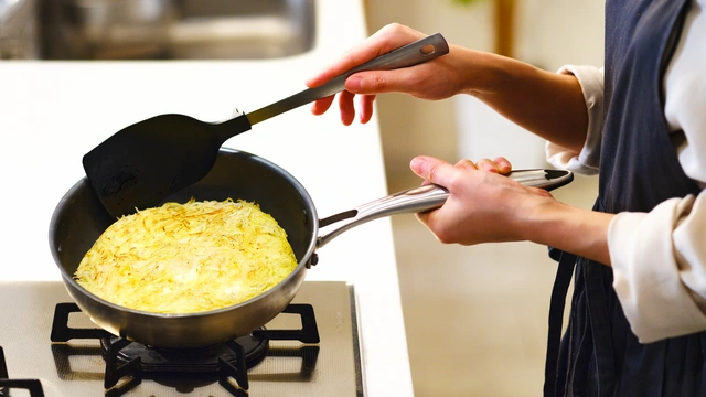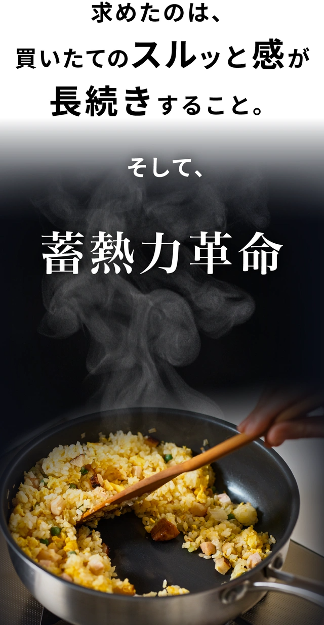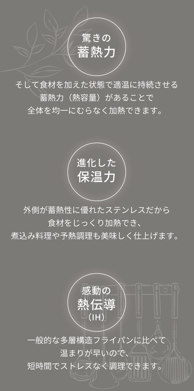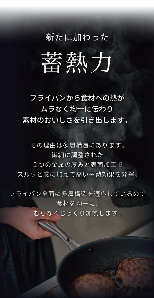 フライパン自体がしっかりと熱を蓄えるので、従来のアルミニウム一層構造のフライパンに比べ、中までじっくり火が通ります。